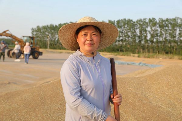 潘智慧是社區(qū)工作者,丈夫朱文彤作為農(nóng)場(chǎng)公司辦公室主任,是支農(nóng)志愿服務(wù)隊(duì)第一小隊(duì)負(fù)責(zé)人,掛鉤地處農(nóng)場(chǎng)最北端的農(nóng)牧中心,負(fù)責(zé)掛鉤單位搶收及場(chǎng)面相關(guān)指揮協(xié)調(diào)工作。在知曉丈夫“出征”后,今年50歲的她也不甘落后,第一時(shí)間主動(dòng)請(qǐng)纓前往地處農(nóng)場(chǎng)最南端、小麥種植面積高達(dá)1.8萬(wàn)余畝的西陬生產(chǎn)區(qū)。她早出晚歸,每天穿梭在各個(gè)曬場(chǎng),和大家一起翻場(chǎng)、堆場(chǎng)、協(xié)助運(yùn)糧。炎熱的天氣曬得她臉部脫皮,手上腳上磨出了老繭,腰疼的老毛病也隨之加重,但她咬牙堅(jiān)持,從不抱怨,她和丈夫成為“三夏”前沿南北守望、遙相呼應(yīng)的最佳“夫妻檔”。