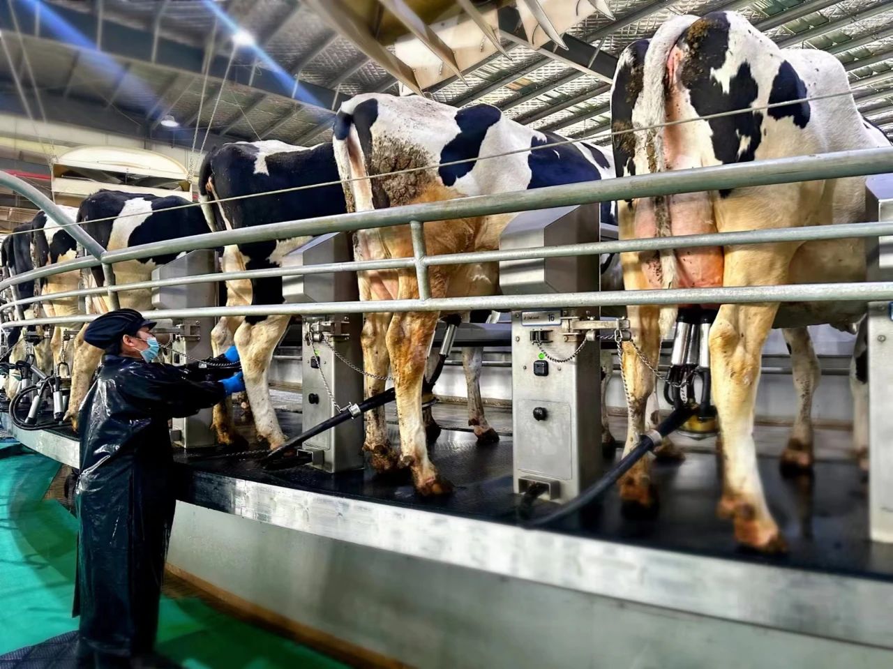 走進擠奶廳,只見轉(zhuǎn)盤緩緩轉(zhuǎn)動,一頭頭奶牛依次走上擠奶轉(zhuǎn)盤。擠奶工手法嫻熟,挨個為奶牛乳房進行消毒,并精準地將奶杯套在乳房上。隨著脈動器的工作,潔白的乳汁順著奶廳管道迅速冷卻后最終匯集到奶倉中,等待被送往加工廠,開始它們的新旅程。整個牧場忙碌而和諧,展現(xiàn)了新年伊始的獨特魅力。
