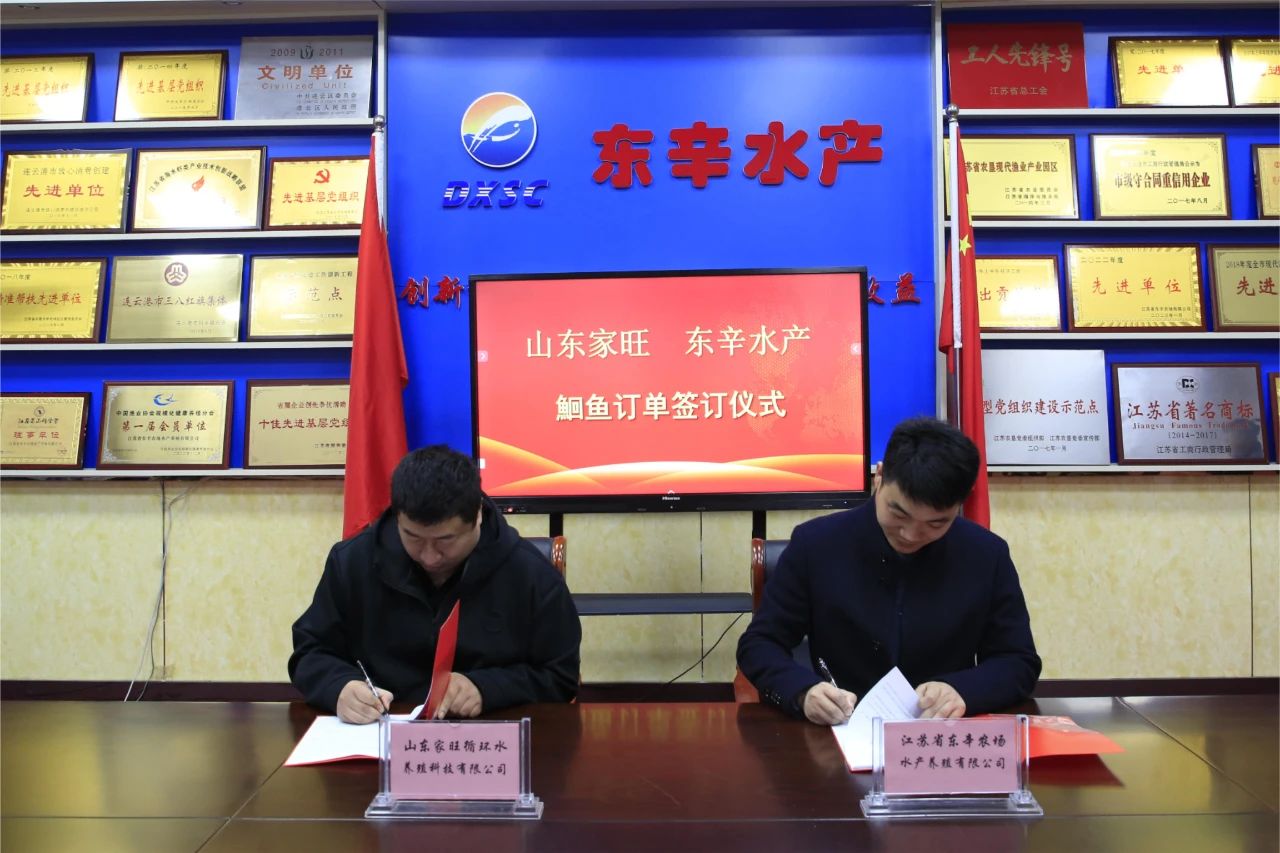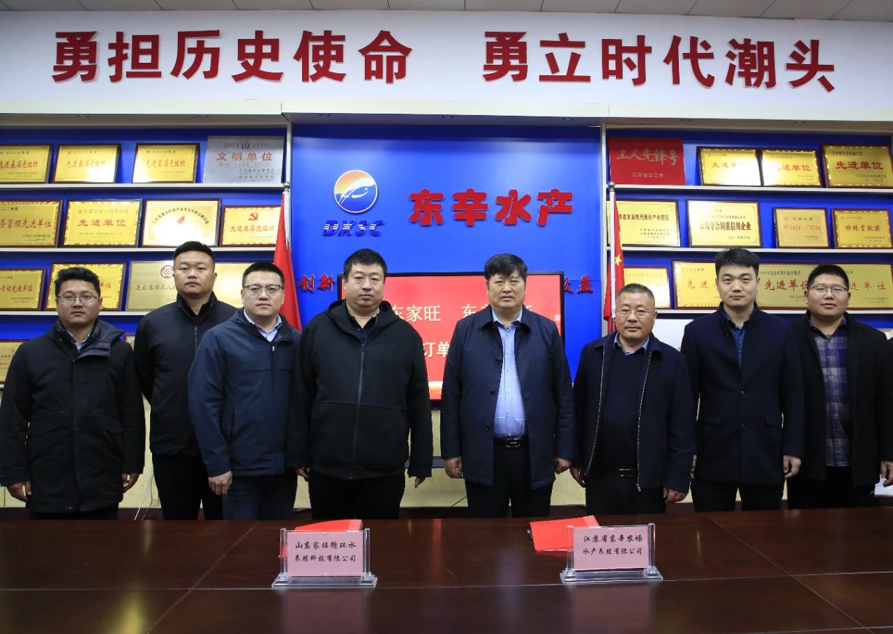 3月24日上午,江蘇省東辛農(nóng)場(chǎng)水產(chǎn)養(yǎng)殖有限公司與山東家旺循環(huán)水養(yǎng)殖科技有限公司簽訂300萬斤鮰魚北京貨訂單合同。東辛農(nóng)場(chǎng)公司黨委委員、副總經(jīng)理王緒國,山東家旺董事長(zhǎng)魯治杰一行,水產(chǎn)公司董事長(zhǎng)潘海軍、經(jīng)理王加鵬及其他班子成員參加簽約儀式。