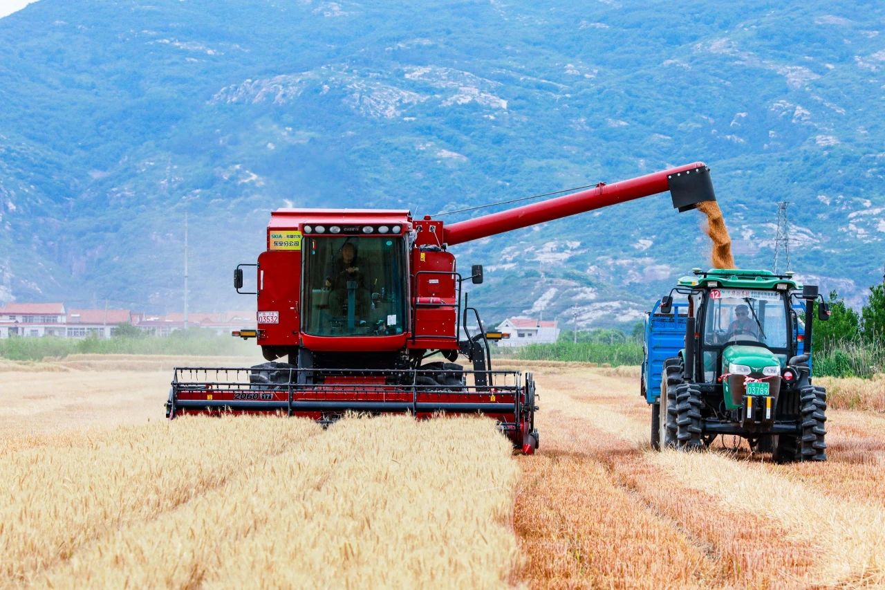 在海軍生產(chǎn)區(qū)海堤大隊(duì)金色的麥田里,農(nóng)機(jī)應(yīng)急保障中心的數(shù)臺(tái)大型國(guó)有收割機(jī)約翰迪爾C2400開(kāi)啟了“忙碌”模式。伴隨著收割機(jī)的轟鳴聲,飽滿(mǎn)的麥穗進(jìn)入脫粒箱,麥稈被粉碎還田,脫粒后的小麥從收割機(jī)出糧口傾瀉進(jìn)運(yùn)糧車(chē),收割、脫粒、裝車(chē)一氣呵成,收割好的糧食立即運(yùn)往場(chǎng)面翻曬,田間曬場(chǎng)處處呈現(xiàn)出一派豐收繁忙景象。“今年海軍生產(chǎn)區(qū)種植小麥4471畝,產(chǎn)量喜人,平均畝產(chǎn)能達(dá)1100斤,較去年增產(chǎn)100斤。”海軍生產(chǎn)區(qū)負(fù)責(zé)人陳晨喜悅地說(shuō)道。目前,農(nóng)牧中心及本部各生產(chǎn)區(qū)小麥已收割過(guò)半,預(yù)計(jì)6月10日晚大面積收割結(jié)束。