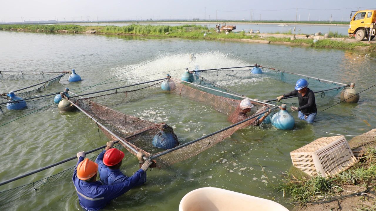 “1,2,3,收網(wǎng)!”清晨6點(diǎn),在東辛水產(chǎn)集體養(yǎng)殖場內(nèi),起魚號子響聲震天,隨著漁網(wǎng)慢慢收攏,塘口內(nèi)浪花飛濺,無數(shù)肥美鮮活的魚兒爭相跳躍,激起一陣陣潔白的浪花,豐收的歡騰場面引人駐足觀看。工人們拉網(wǎng)起捕、快速分揀、稱重裝車……一輛輛滿載鮰魚的貨車接連駛出基地,陸續(xù)發(fā)往山東、天津、廣東等地,全力保障商品魚市場供應(yīng)。