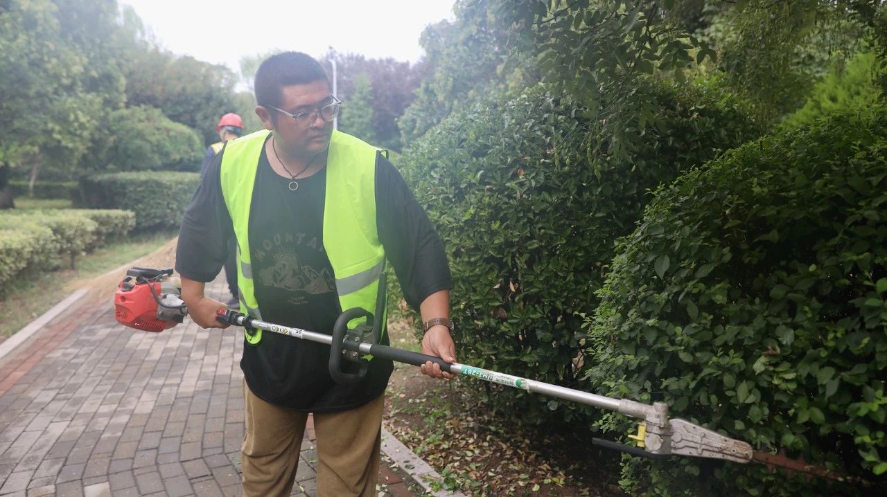 天空灰蒙蒙的,細(xì)雨如絲,微風(fēng)輕輕地拂過大地,為這場(chǎng)綠化行動(dòng)增添了幾分詩意。東辛廣場(chǎng)上、公園內(nèi),林業(yè)公司的養(yǎng)護(hù)團(tuán)隊(duì)在綠化帶四周提前擺放好警示牌和安全錐,他們身著工作服,手持修剪工具,穿梭在廣場(chǎng)和公園的各個(gè)角落,他們的身影在雨幕中若隱若現(xiàn),卻顯得格外堅(jiān)定。“大家注意安全,雨天路滑,小心腳下?!绷謽I(yè)公司張隊(duì)長不時(shí)地提醒著隊(duì)員們。他的聲音雖然被細(xì)雨略微掩蓋,但那份關(guān)切與責(zé)任卻清晰地傳達(dá)到每個(gè)人的心中?!胺判陌桑瑥堦?duì),我們都穿了防滑鞋,沒問題的?!币晃火B(yǎng)護(hù)工人笑著回應(yīng)道。工人們手持長桿綠籬機(jī),嫻熟地進(jìn)行修剪,做到平面和側(cè)面弧度平滑,修剪高度一致、棱角分明、形狀飽滿。不一會(huì)功夫,綠籬就在他們手中呈現(xiàn)出層次分明、整齊劃一的景觀造型。