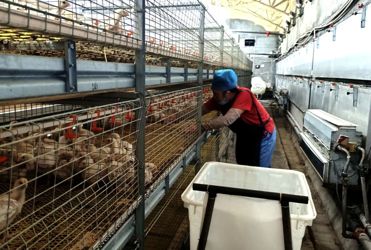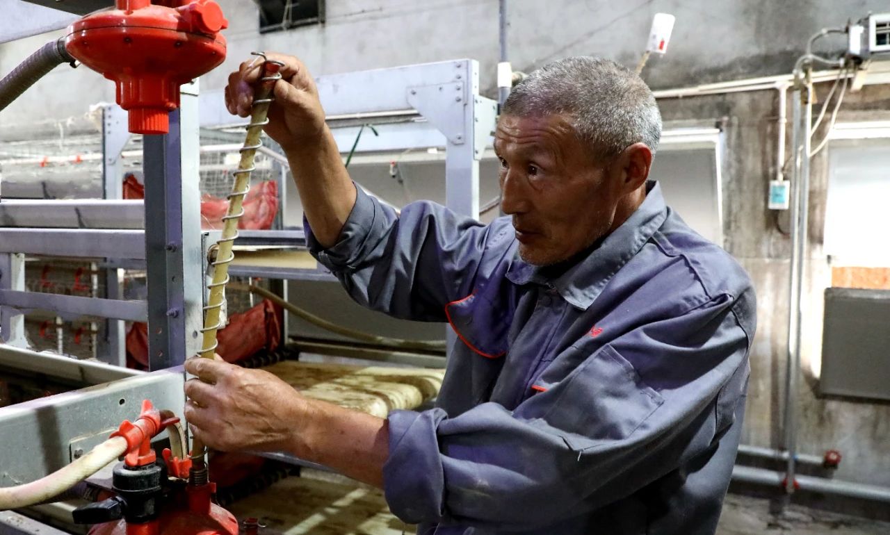 走進(jìn)東升雞場(chǎng)25號(hào)雞舍,小雞們正安靜地窩在一起閉著眼睛休息,工人們則趁著溫度適宜、雛雞休息的時(shí)候開展分雛前準(zhǔn)備工作。只見他們熟練地將要使用的下層水線進(jìn)行運(yùn)轉(zhuǎn),檢查機(jī)器設(shè)備,調(diào)整好水線高度和水壓,保證分雛肉雞的正常飲水;擦拭肉雞料槽,保持料槽整潔,飼料充足;轉(zhuǎn)動(dòng)糞帶,將糞帶上因沖洗而殘留的水分排出,給肉雞提供舒適的飼養(yǎng)環(huán)境?!懊珉u進(jìn)場(chǎng)后一般是先進(jìn)入中層飼養(yǎng),隨著日齡的增長(zhǎng),在8-10天和16-18天左右會(huì)進(jìn)行兩次分雛,根據(jù)‘分早不分晚,留弱不留強(qiáng)’的原則,平均分布在三層籠舍中,我們現(xiàn)在進(jìn)行的是16-18天的第二次分雛。分雛工作為肉雞提供了足夠的生長(zhǎng)空間,提高了飼料利用率,減少了浪費(fèi),能夠保證雞群的整齊度?!睎|升雞場(chǎng)技術(shù)員王偉說(shuō)道。