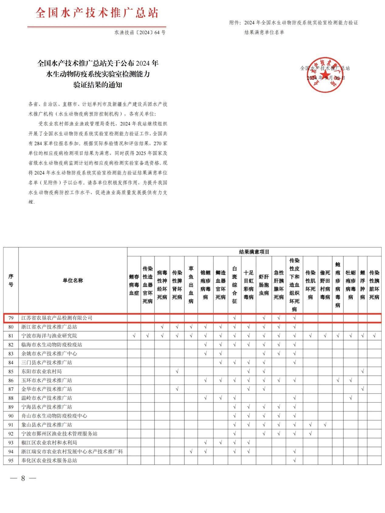 近日,全國(guó)水產(chǎn)技術(shù)推廣總站公布了2024年全國(guó)水生動(dòng)物防疫系統(tǒng)實(shí)驗(yàn)室檢測(cè)能力驗(yàn)證結(jié)果,江蘇農(nóng)墾農(nóng)產(chǎn)品檢測(cè)有限公司參報(bào)的甲殼類急性肝胰腺壞死病、白斑綜合征、蝦肝腸胞蟲病、傳染性皮下及造血組織壞死病4種疫病病原檢測(cè)項(xiàng)目結(jié)果均為滿意,并獲得2025年國(guó)家及省級(jí)水生動(dòng)物疫病監(jiān)測(cè)計(jì)劃的相應(yīng)疫病檢測(cè)實(shí)驗(yàn)室備選資格。