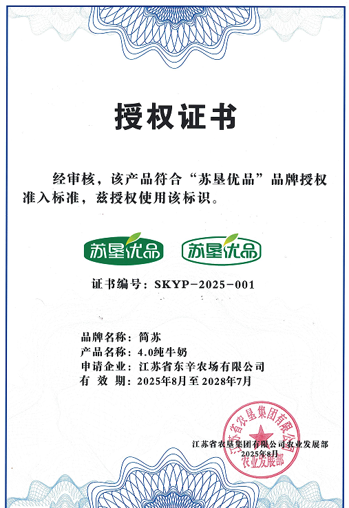 近日,東辛農(nóng)場(chǎng)的明星產(chǎn)品“簡(jiǎn)蘇”4.0純牛奶成功入選首批“蘇墾優(yōu)品”品牌授權(quán)準(zhǔn)入名單,正式邁入集團(tuán)公司中高端農(nóng)產(chǎn)品品牌陣營(yíng)。此次入選,不僅是對(duì)東辛農(nóng)場(chǎng)“簡(jiǎn)蘇”牛奶品質(zhì)的高度認(rèn)可,更是對(duì)其深耕品質(zhì)的權(quán)威背書。