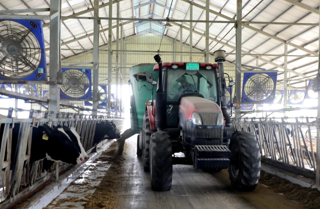清晨5點(diǎn)30分,飼料加工區(qū)已忙碌起來(lái)。工作人員駕駛鏟車(chē)在飼料倉(cāng)間穿梭,精準(zhǔn)調(diào)配奶牛每日所需的“膳食”。飼養(yǎng)員根據(jù)牛群的不同生長(zhǎng)階段定制專(zhuān)屬食譜,并不定時(shí)抽檢飼料樣本,嚴(yán)保奶牛“口糧”安全。夏天,為防止奶牛熱應(yīng)激,飼料中會(huì)添加維生素及酵母培養(yǎng)物;冬天則側(cè)重能量補(bǔ)給,多添優(yōu)質(zhì)青貯和能量飼料。飼養(yǎng)員熟練操作TMR飼料投喂機(jī),將飼料精準(zhǔn)投放到每一欄位,推料車(chē)不時(shí)往返作業(yè),確保飼料新鮮均勻。進(jìn)食結(jié)束后,飼養(yǎng)員立即清理料槽余垢,從源頭保障奶牛健康。
