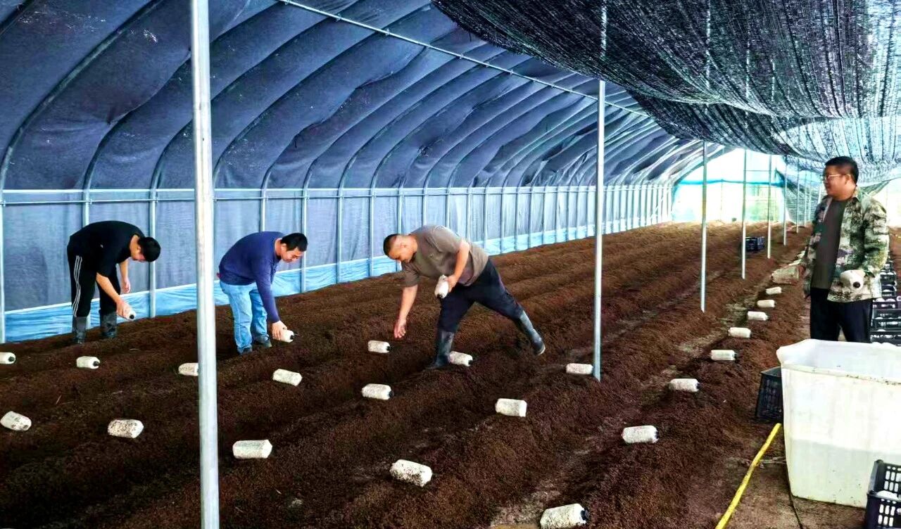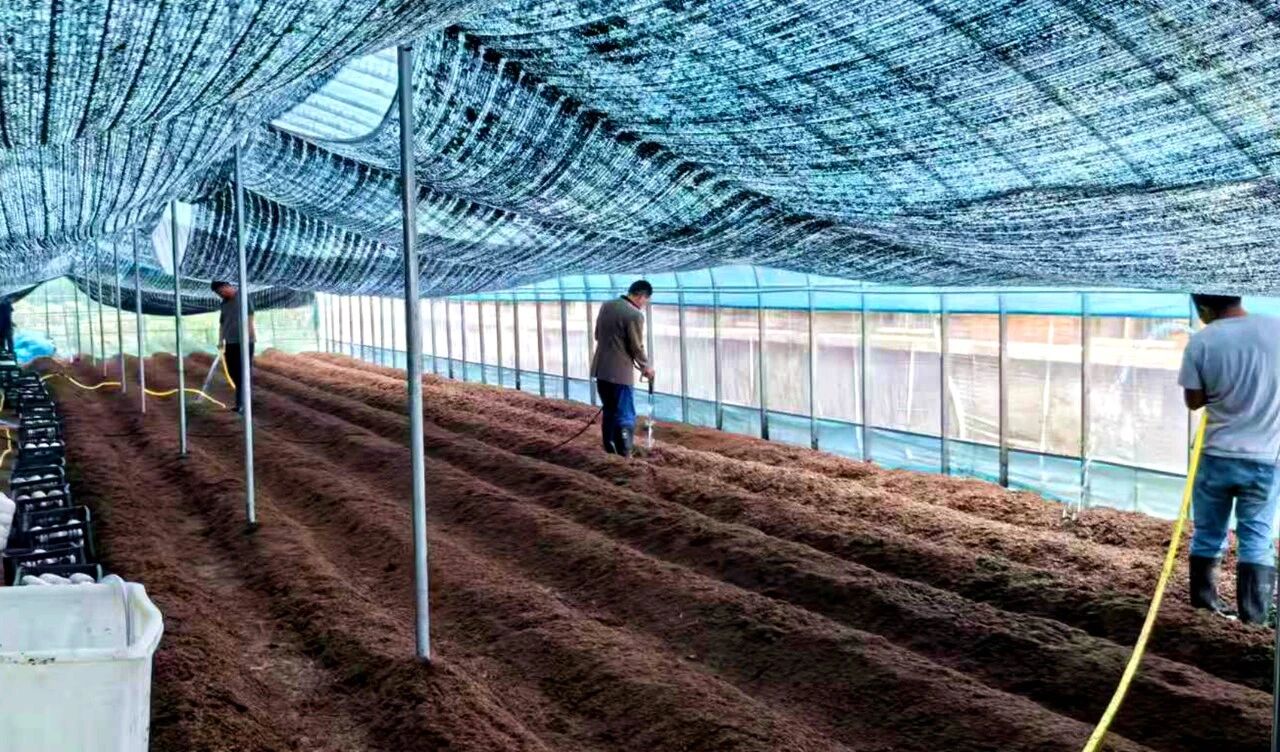 走進(jìn)基地,一派熱火朝天的勞動(dòng)景象撲面而來:有的工人將發(fā)酵好的培養(yǎng)料均勻鋪在菌床上;有的蹲在田壟邊,按照間距播撒菌種;還有的細(xì)心澆灌,確保覆土層濕度達(dá)標(biāo)。公司負(fù)責(zé)人孫道鵬介紹,種植所需的培養(yǎng)料由25%的稻殼牛糞、玉米芯和木屑等原料混合后發(fā)酵,最終成為赤松茸菇的“營養(yǎng)餐”。而采收后的廢菌棒、菌渣運(yùn)回肥料生產(chǎn)線,再經(jīng)加工制成有機(jī)肥反哺農(nóng)田,形成內(nèi)部循環(huán)產(chǎn)業(yè)鏈,實(shí)現(xiàn)資源的最大化利用。