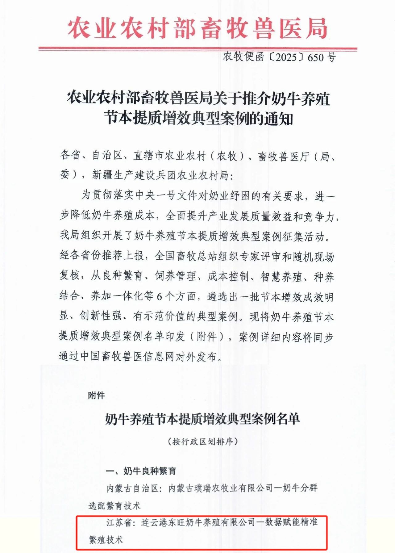 近日,農(nóng)業(yè)農(nóng)村部畜牧獸醫(yī)局公布了全國奶牛養(yǎng)殖節(jié)本提質(zhì)增效典型案例遴選結(jié)果,東辛農(nóng)場東旺奶牛公司憑借其“數(shù)據(jù)賦能精準(zhǔn)繁殖技術(shù)”成功入選,成為江蘇省三家上榜企業(yè)之一。