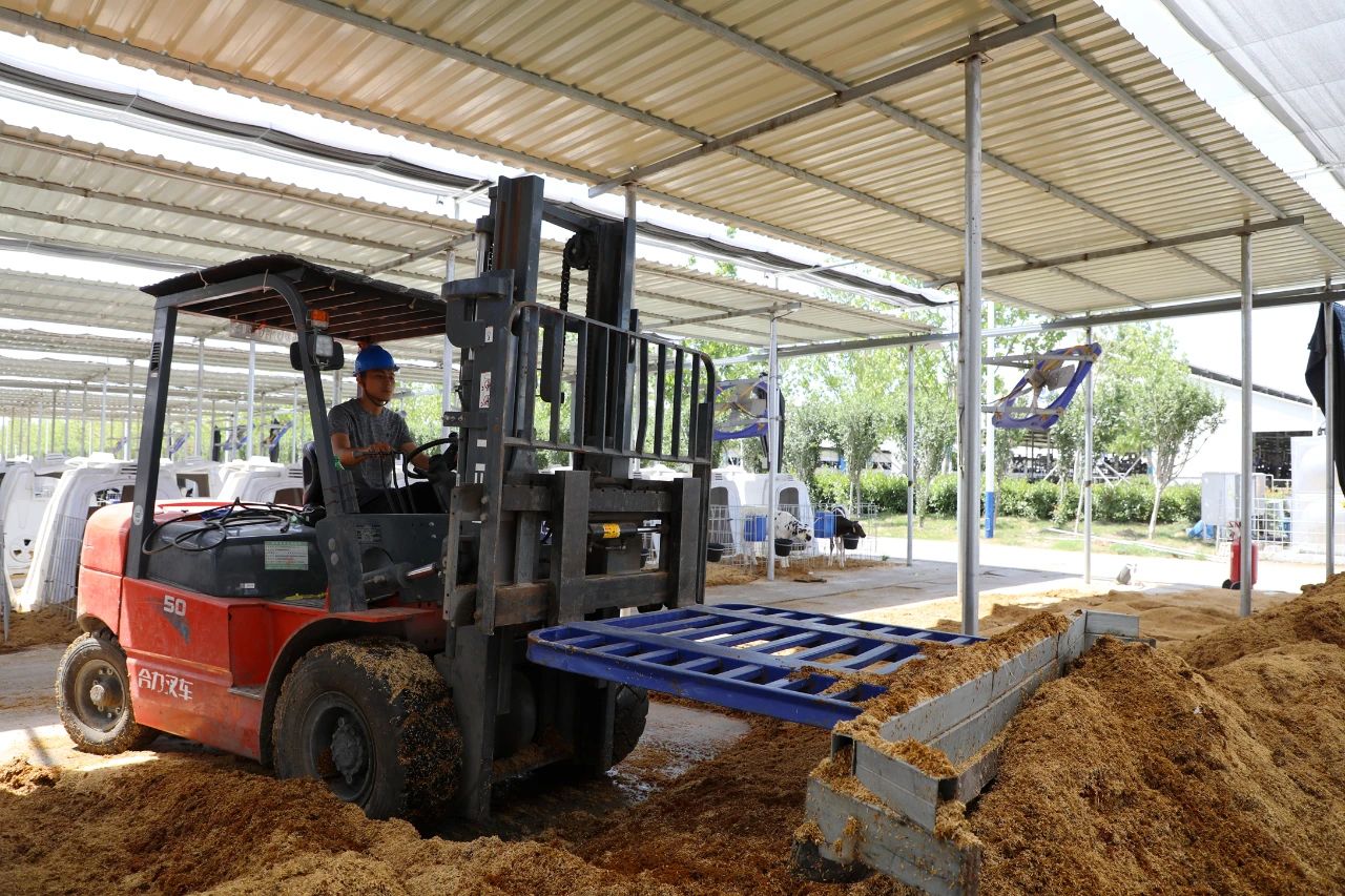 改造托盤與方管,叉車秒變“清料神器”。每年產(chǎn)犢高峰期過后,犢牛飼養(yǎng)車間工作人員需將1000余個使用過的犢?!皠e墅”逐個進行消毒洗刷,留下的廢棄墊料也需及時清理運走。犢牛島頂棚較低,鏟車高度無法在棚區(qū)內(nèi)靈活作業(yè),犢牛飼養(yǎng)車間負責(zé)人吳棟與維修組工人馮全勤根據(jù)生產(chǎn)實際,對牧場現(xiàn)有叉車進行改造,共同設(shè)計出了“清料神器”,他們將兩根長約3米的鍍鋅方管焊接在托盤上,與叉車完美契合,同時匹配犢牛島行間距與高度,確保叉車能夠進退自如、靈活作業(yè),原本需要20余人花費三天時間完成的清料工作,現(xiàn)在僅需1人、1輛叉車、1天內(nèi)即可完成清料任務(wù),大大節(jié)省了用工和設(shè)備投入成本,工作效果提高了200%。此外,“清料神器”還有多種用途,清除場區(qū)路面積雪、落葉、泥巴等效果也十分顯著,此款實用型小發(fā)明深受牧場員工好評。