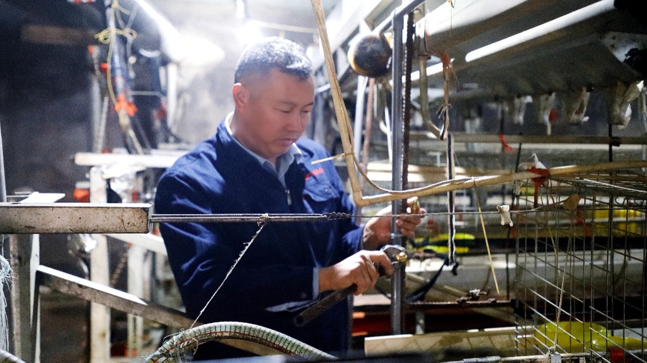 走進(jìn)東辛東米雞場(chǎng),場(chǎng)長(zhǎng)徐洪健正專注地對(duì)雞舍高壓噴霧加濕裝置進(jìn)行改裝升級(jí)。